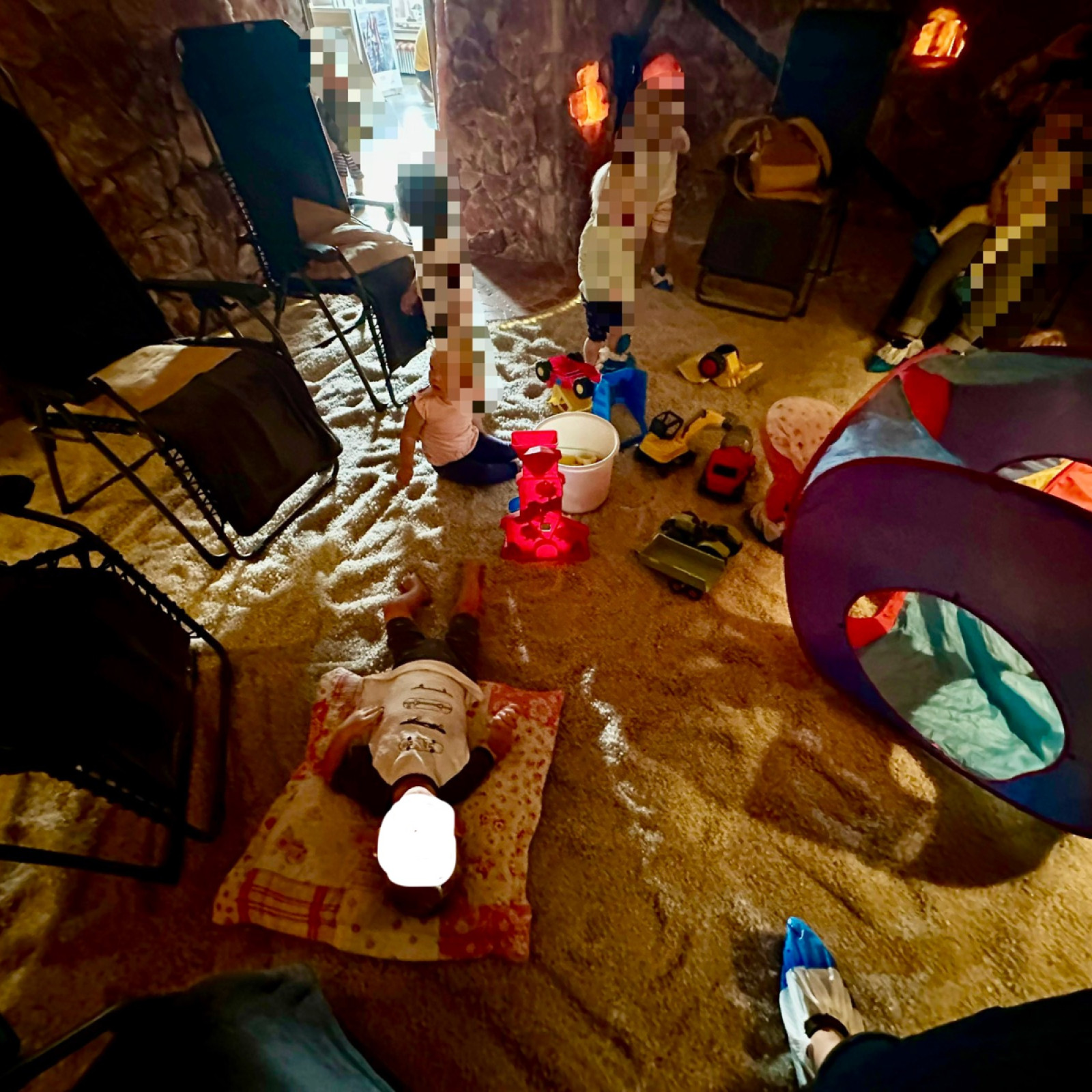 • In der kalten Jahreszeit besuchen wir regelmäßig die Salzgrotte (Salz Vital) in Spellen, für den Hin- und Rückweg steht ein komfortabler 6er-Buggy zur Verfügung. Die salzhaltige Luft wirkt positiv auf die Atemwege. Das Salz sorgt dafür, dass die Flüssigkeit in den Lungen und Bronchien extrahiert und deren Durchblutung verbessert wird. Dabei schwellen die Bronchien ab und Schleim lässt sich leichter abhusten. Das bringt Linderung bei Allergien, Erkältungen und Asthma. Wir besuchen die Salzgrotte sehr oft zusammen mit der Kindergroßtagespflege „Kleine Abenteurer“ aus Mehrum.